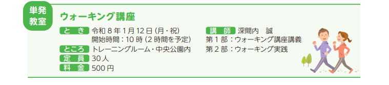 令和8年1月12日に開催を予定していました「第6回ウォーキング講座」ですが、誠に勝手ながら諸般の事情により開催中止とさせていただきます。