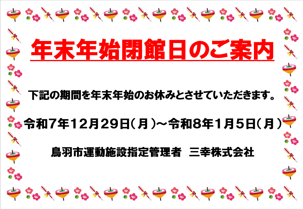 鳥羽市運動施設は12月29日㈪から1月5日㈪までの間、年末年始のお休みとさせていただきます。
